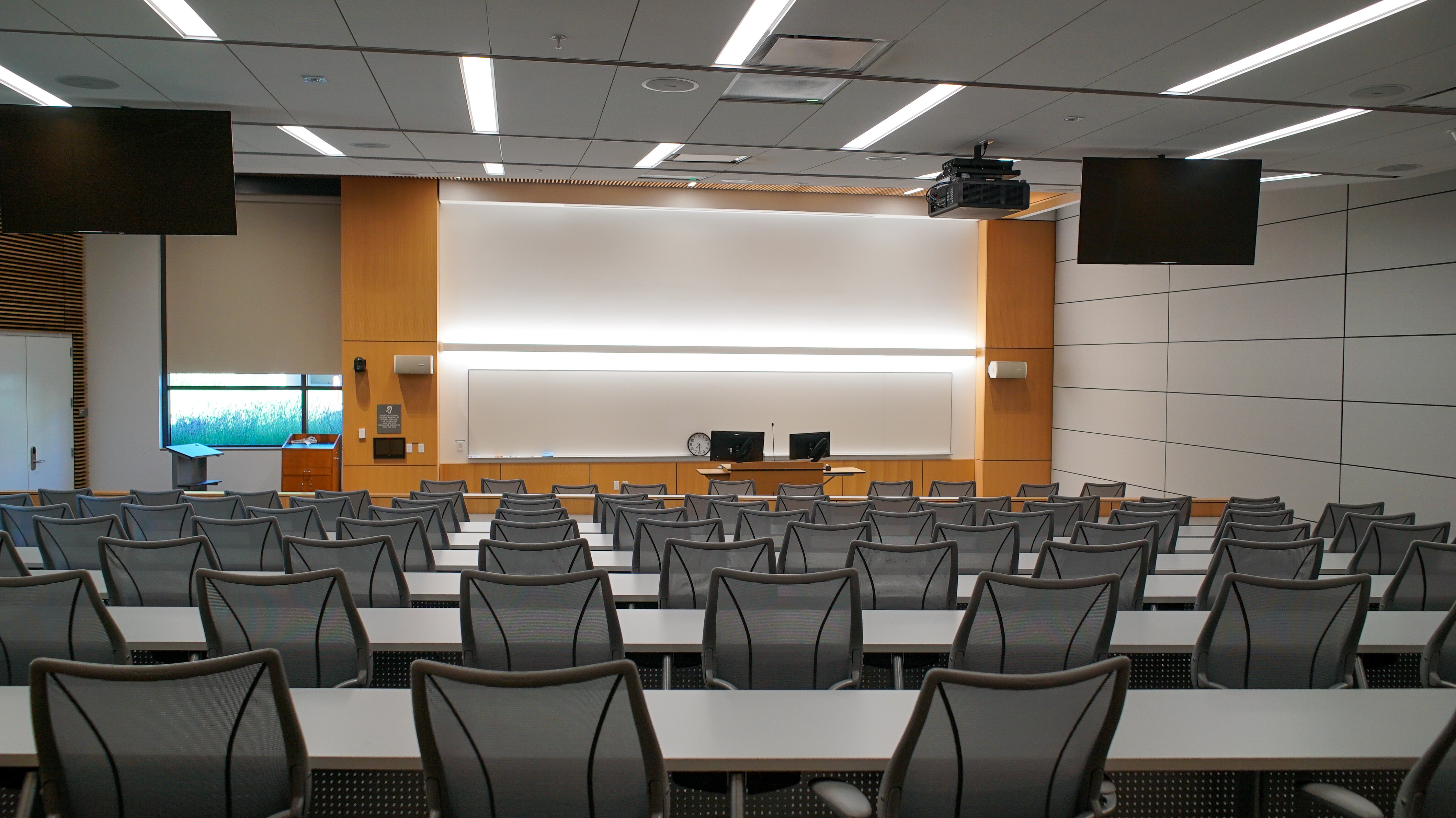 This functions as both a classroom and event space divided by a partition. If you need the partition brought up, we have the key available for checkout at the law library circulation desk. Since it is an event space, you have more options in regards to wireless microphone configurations. For example, if you have a panel of four for an event, we can setup four wireless or wired microphones in the room for your panel.